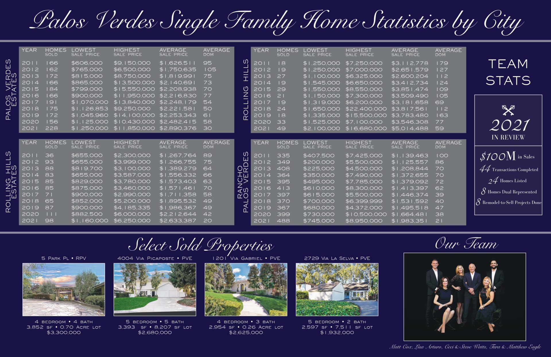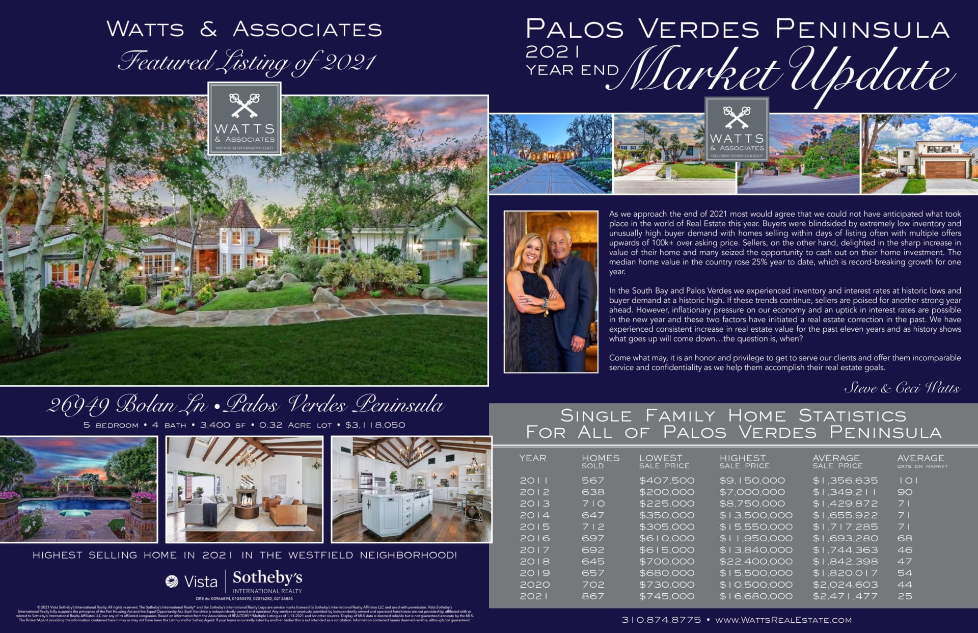 In the South Bay and Palos Verdes we experienced inventory and interest rates at historic lows and buyer demand at a historic high. If these trends continue, sellers are poised for another strong year ahead. However, inflationary pressure on our economy and an uptick in interest rates are possible in the new year and these two factors have initiated a real estate correction in the past. We have experienced a consistent increase in real estate value for the past eleven years and as history shows what goes up will come down…the question is, when?